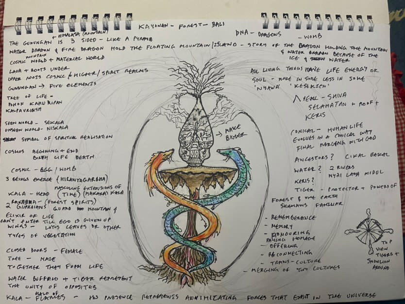 Mount Merapi and the Fire Nagaraja sleeping at it’s base, the Southern sea and it’s Queen, Ancestors, Protectors and the Spirit Tiger. She was moved to tears on learning from the great grandson of Adipati Jayadiningrat (the Ancestor who protected the lava from flowing to create destruction) that the same ‘ge-lanang’ tree (Oroxylum indicum) was never cut as it protected and helped barricade the lava from flowing. They were moved deeply and experienced collective ‘merinding’ (goosebumps), this was the moment all of them realised their interconnection even though they were oceans apart.
